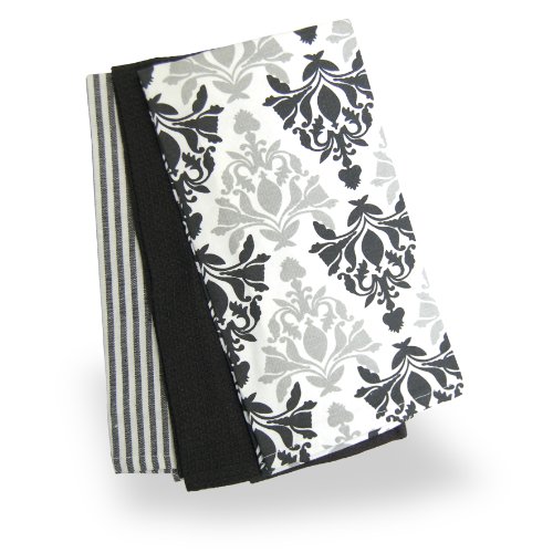 Black, Grey & White Damask Patterned 3 Tea Towel Set