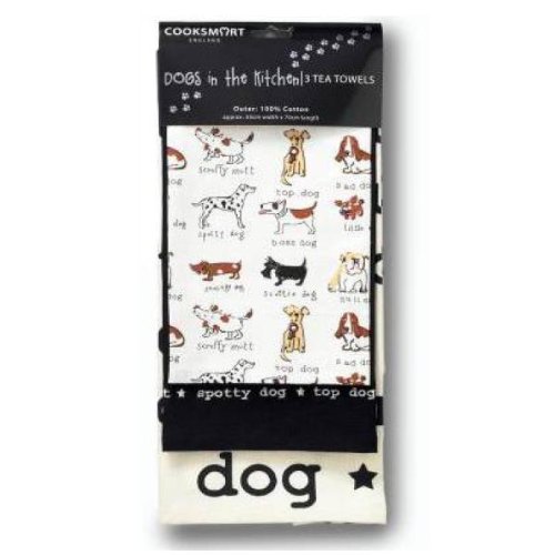 These fun tea towel packs feature 3 towels, made from 100% cotton and measuring approximately 50x70cm each. One towel features pictures of various dogs (see picture), the second towel is plain black with embroidered text around the outer edge, and the third towel features printed text all over.