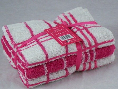 Pack of 3 FUSCHIA PINK & WHITE 100% Cotton Terry Tea Towels