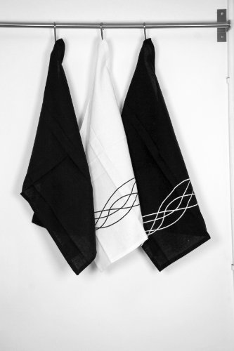 100% cotton, machine washable 3pc tea towel set. Cotton hanging hook. Set include's 1 plain black , 1 white with black detail and 1 black with white detail tea towel 40 x 60cm approx.