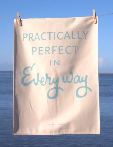 Practically Perfect in Every Way Tea Towel. Superb quality natural cotton tea towel, featuring the classic Mary Poppins quote "Practically Perfect in Every Way". This beautifully soft tea towel includes a useful sewn hanging hook and is packaged in a cardboard tube - for easy gift giving. No one likes doing the drying up... but if you use the Practically Perfect in Every Way Tea Towel it will at least bring a smile to your face!