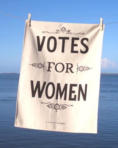 Votes For Women Tea Towel. Superb quality natural cotton tea towel, featuring the historical important Suffragettes poster design Votes For Women. This beautifully soft tea towel includes a useful sewn hanging hook and is packaged in a cardboard tube - for easy gift giving. No one likes doing the drying up... but if you have to do it, why not use the Votes For Women Tea Towel and reflect on what the Suffragettes went through!