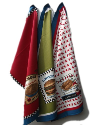100% printed cotton tea towels (Set of three) - 50 cm x 70 cm - French retro style. Hot dog ~ Hamburger (Fast food) FREE DELIVERY
