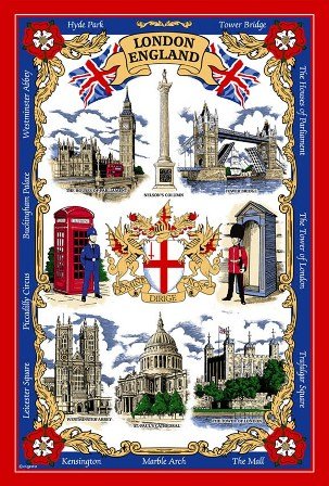 A Classic London Souvenir Tea Towel featuring many of Londons historical tourist attractions,