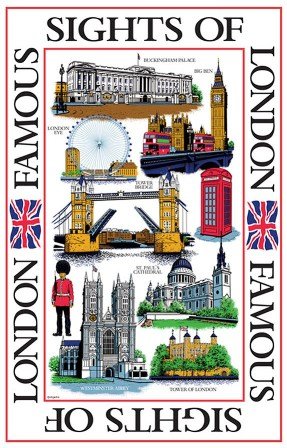 Classic London Scenes on a White Tea Towel. Makes an ideal souvenir gift.