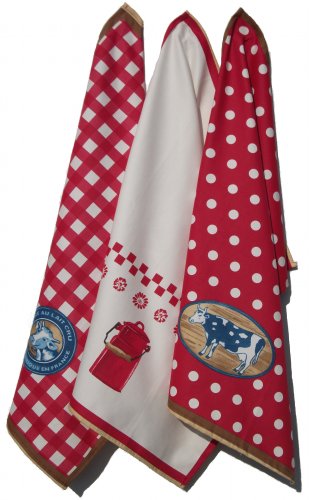 Set of three 100% printed organic cotton tea towels - 50 cm x 70 cm - French retro style - (Dairy farm) FREE DELIVERY