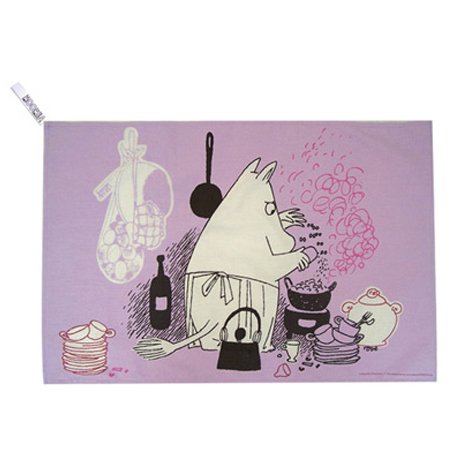 Lilac coloured cotton Tea Towel, featuring an evocative image of moominmamma busy cooking